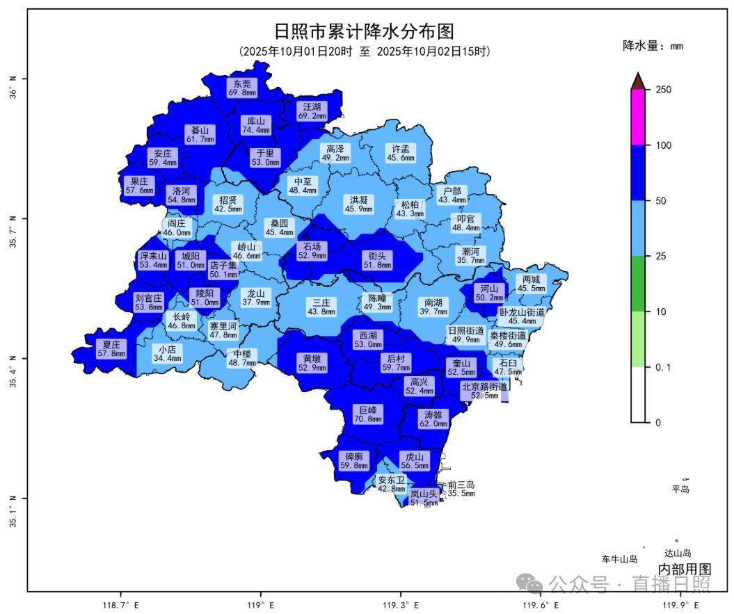 各区县平均降水量如下:东港区49.2毫米,岚山区55.9毫米,莒县52.7毫米,五莲县48.3毫米,经济技术开发区52.5毫米,山海天旅游度假区45.4毫米,高新技术产业开发区50.0毫米。